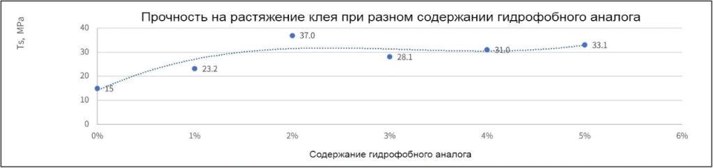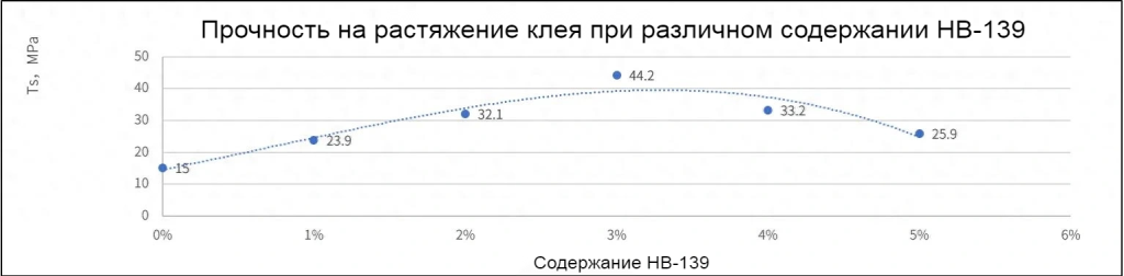 Как показано на рисунке 1, наблюдается производительность HB-139: при добавлении 0% прочность клея на растяжение составляет всего 15 МПа; при увеличении добавки до 1% прочность на растяжение повышается до 23,9 МПа; при дальнейшем увеличении до 2% достигается 32,1 МПа; при 3% достигается пик 44,2 МПа, что почти вдвое превышает прочность основы. Затем, при увеличении добавки до 4% прочность снижается до 33,2 МПа; при 5% снижается дальше до 25,9 МПа. В целом наблюдается типичная параболическая тенденция «сначала рост, потом падение», что указывает на существование оптимальной пропорции добавки.
