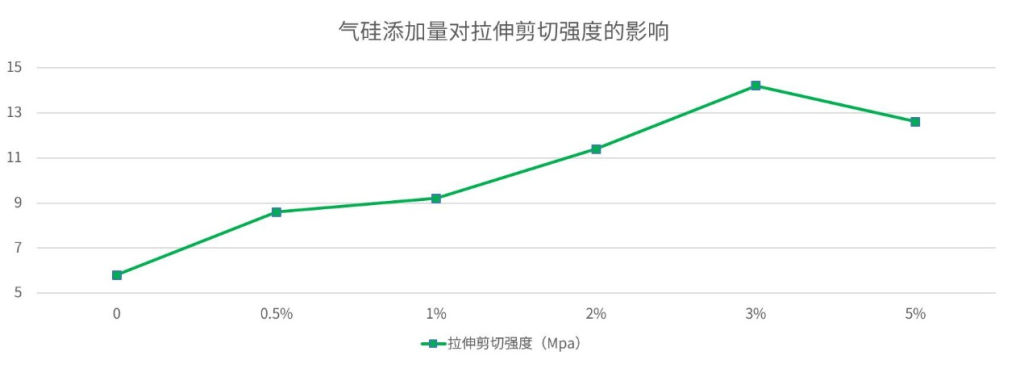 Аналогично, когда нагрузка достигла 5%, прочность на сдвиг немного снизилась до примерно 12,6 МПа. Это еще раз подтверждает принцип, что «умеренное добавление дает лучшие результаты, чем чрезмерная нагрузка». Хотя пирогенный диоксид кремния по своей природе обладает упрочняющими свойствами, его оптимальная дозировка не обязательно максимальна. В практическом производстве необходимо найти баланс между стоимостью наполнителя, сложностью обработки и конечными характеристиками, чтобы определить оптимальное соотношение компонентов в рецептуре.