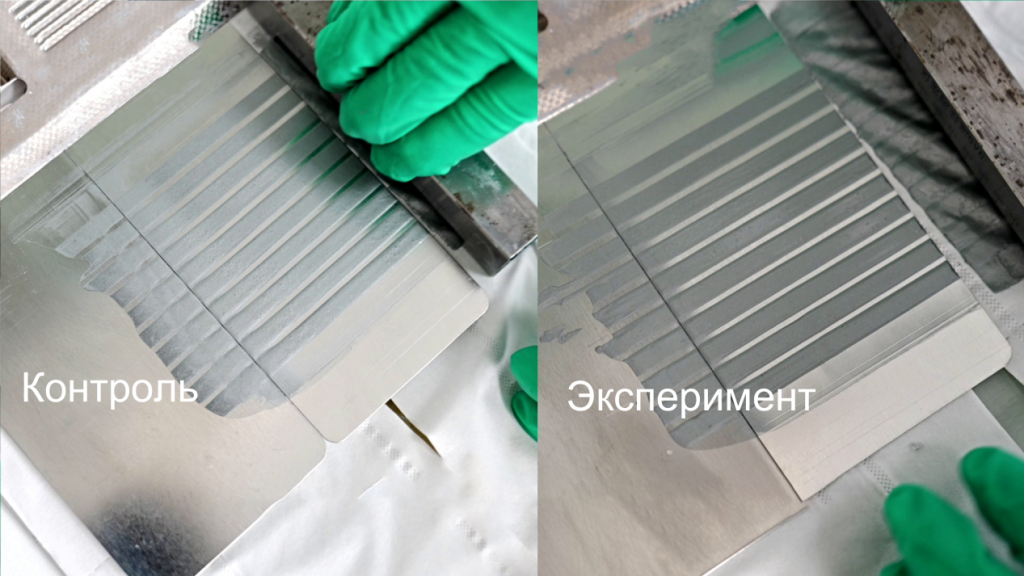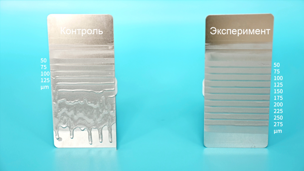 Чтобы проверить способность гидрофобного пирогенного диоксида кремния улучшать антистекающие свойства эпоксидной краски с высоким содержанием цинка, технические специалисты компании Huifu Nano разработали серию наглядных сравнительных экспериментов: в рамках одной и той же базовой рецептуры эпоксидной краски с высоким содержанием цинка в контрольный образец не добавляли никаких антистекающих добавок, а в экспериментальный образец добавили 1,8 % гидрофобного пирогенного диоксида кремния. Сначала с помощью устройства для измерения стекания на стандартные жестяные пластины наносили слои краски различной толщины: 50 мкм, 75 мкм, 100 мкм, 125 мкм, 150 мкм, 175 мкм, 200 мкм, 225 мкм, 250 мкм и вплоть до 275 мкм. Эта серия градиентов толщины охватывает диапазон толщины однослойного покрытия, который может встречаться при обычной нанесении, и позволяет четко охарактеризовать пределы сопротивления стеканию краски при различной толщине пленки.