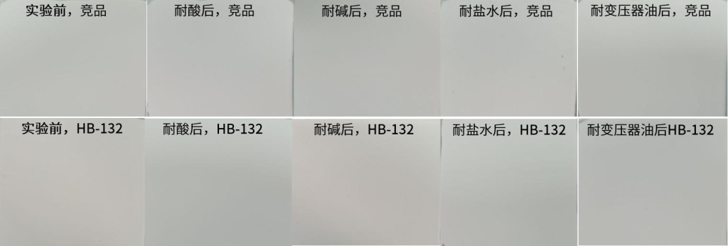 В испытании погружением в 3% раствор соли как покрытие конкурента, так и HB-132 сохранили хороший внешний вид и структуру после 24 часов погружения. Они эффективно противостояли коррозии солевого раствора, обеспечивая надежный защитный барьер для электрооборудования в соленых, влажных средах.