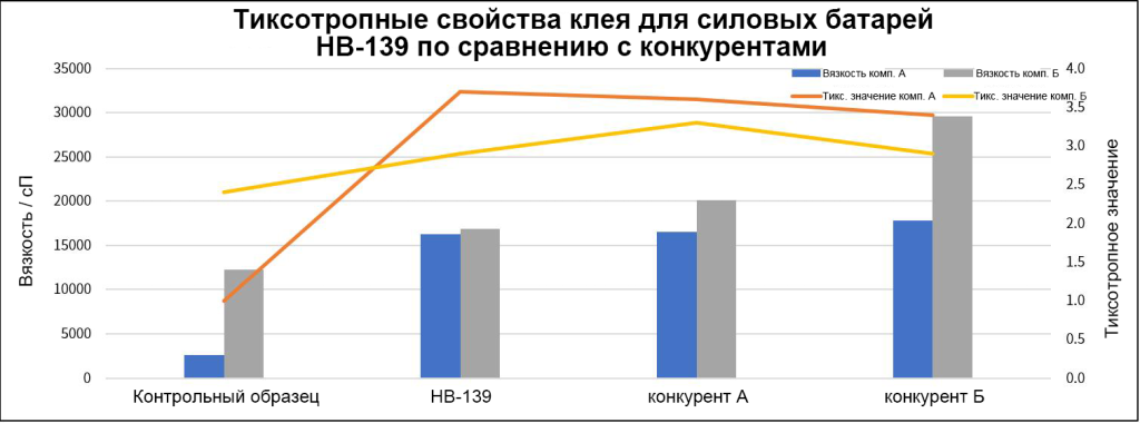 Основная роль газофазного диоксида кремния HB-139 в производстве клеев для аккумуляторных батарей заключается в том, чтобы выступать в качестве загустителя и трексогенного добавки. Клеи должны сохранять низкую вязкость при нанесении с высокой скоростью сдвига, а в состоянии покоя после нанесения или при низкой скорости сдвига система должна обладать высокой вязкостью для обеспечения хорошей защиты от стекания. Как видно из данных таблицы 1, добавление газофазного диоксида кремния позволяет повысить вязкость и трексовые характеристики двухкомпонентного клея для аккумуляторных батарей. Согласно данным по компонентам A и B, HB-139 обладает более высокой трексовостью по сравнению с конкурентными продуктами, при этом демонстрирует умеренные загущающие свойства и лучшую технологичность.