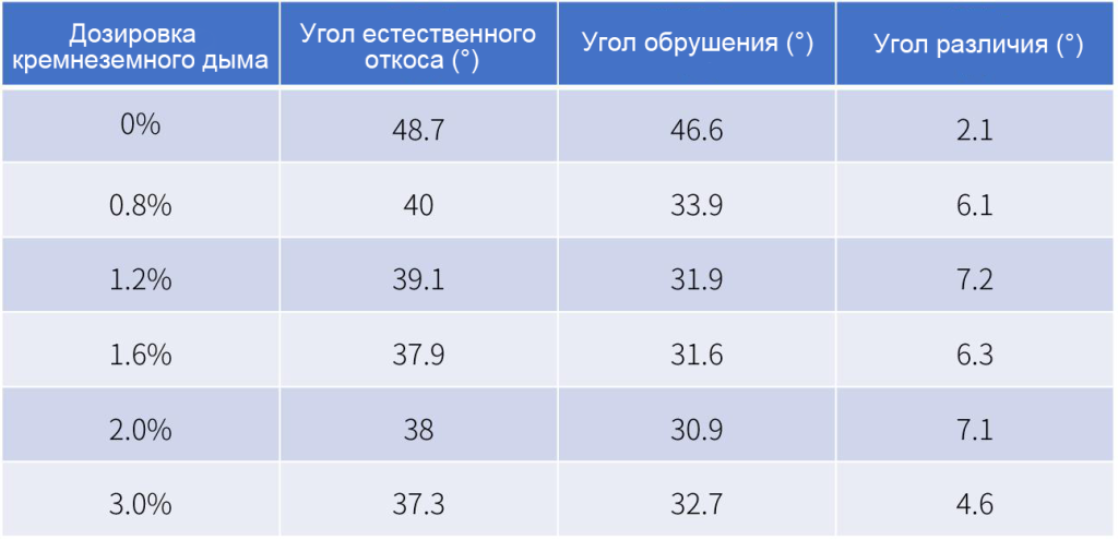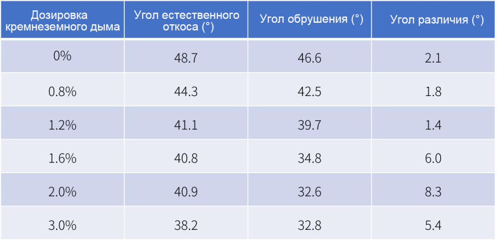 Во-вторых, в боммит добавили 0,8 %, 1,2 %, 1,6 %, 2,0 % и 3,0 % гидрофильного газофазного диоксида кремния HL-380, диспергировали в трехмерном высокоскоростном диспергаторе при скорости 2000 об/мин в течение 5 минут, а после завершения диспергирования измерили углы покоя и разрушения (табл. 2). Анализ данных показывает, что добавление HL-380 эффективно повышает текучесть боммита; при использовании трехмерного высокоскоростного диспергатора добавка в количестве 1,6–2,0 % позволяет достичь наилучшего эффекта улучшения текучести.